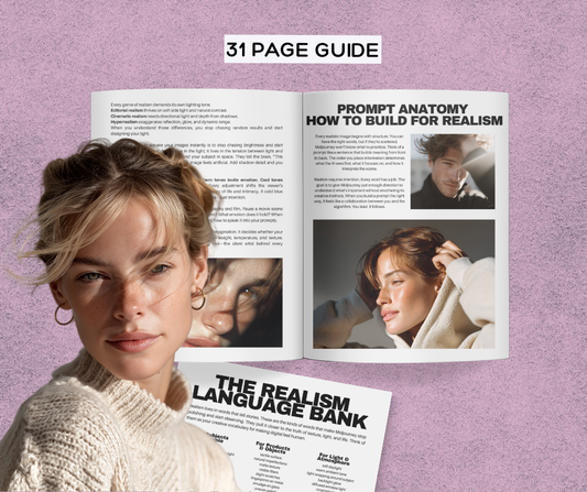 Hyperrealism AI Guide – Master Hyper-Realistic Images in MidJourney | 31-Page Prompt & Cinematic Guide + Resell Rights