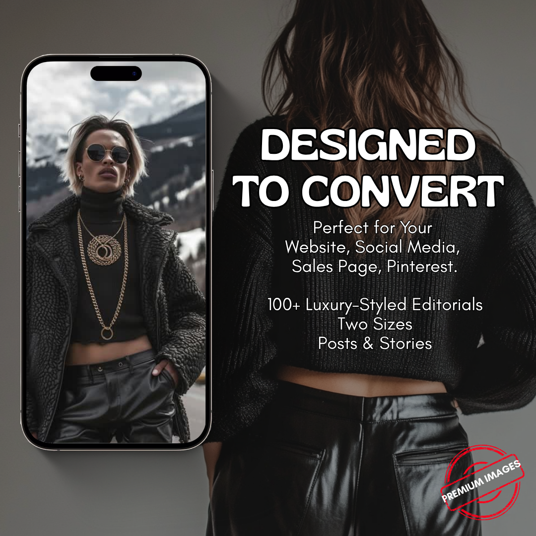 The Iconic Femme AI Image Collection is your secret weapon for building a visually stunning, scroll-stopping brand. Inside, you'll get 100+ high-end, editorial-style AI-generated images in two versatile sizes—ready to enhance everything from your sales pages and social media to ad campaigns and presentation decks.