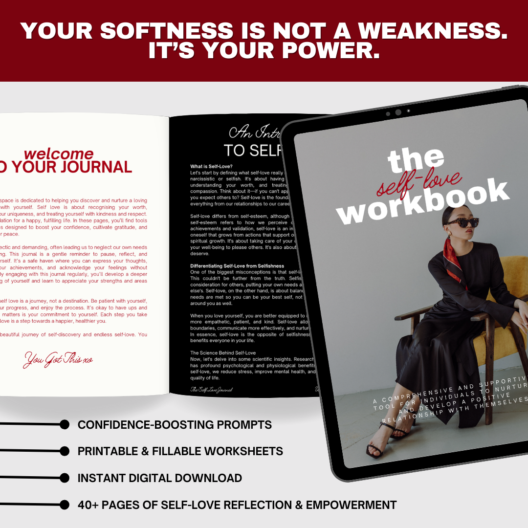 This interactive workbook is more than a journal—it’s a compassionate tool for inner transformation. The Self-Love Workbook leads you through the foundational pillars of radical self-love with powerful prompts, self-awareness exercises, and healing affirmations designed to help you reconnect with your true self.