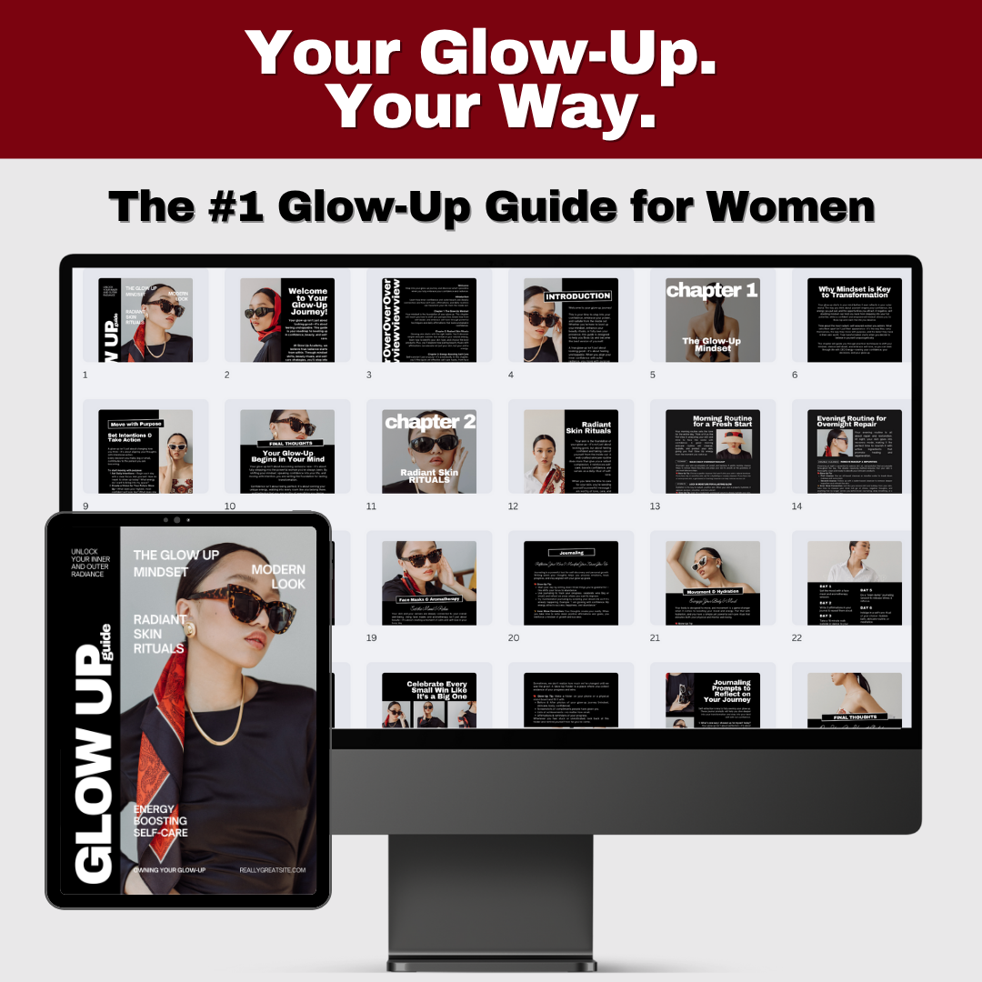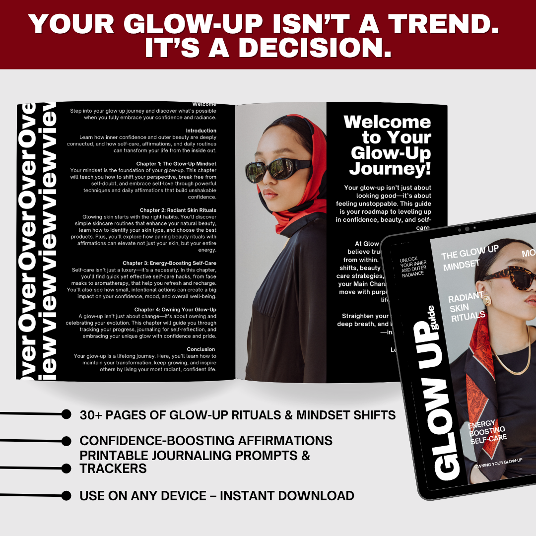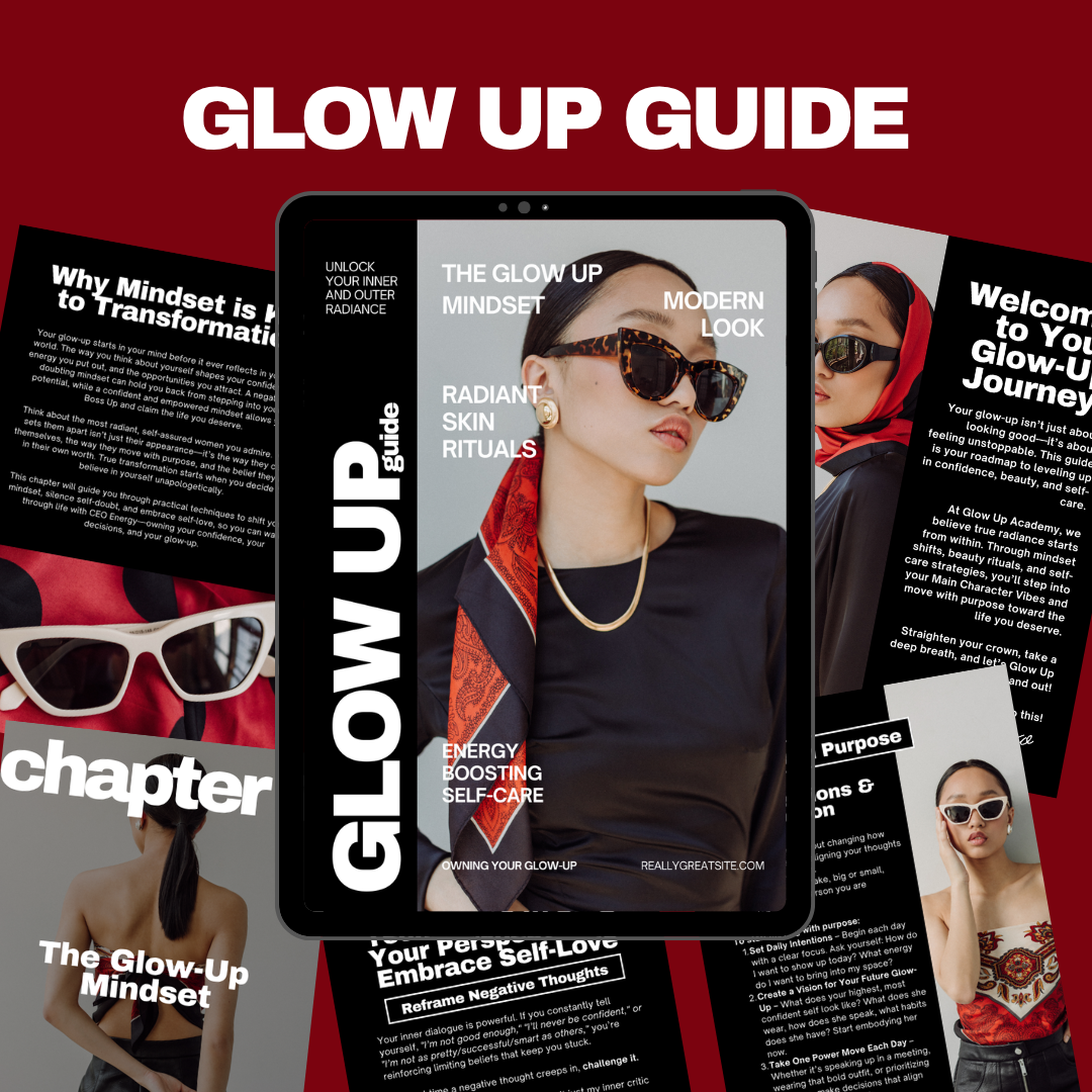 The Ultimate Glow Up Guide is a 33-page transformative digital eBook designed to elevate your confidence, enhance your natural beauty, and establish self-care rituals that radiate powerful energy from the inside out.